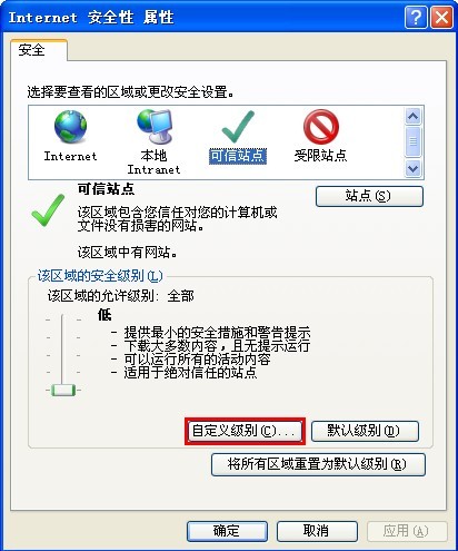 2. 对可信站点进行设置安全,设置方法如下: